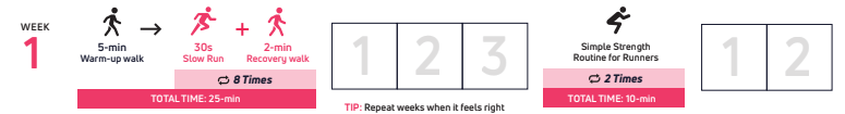 In Week 1, the program asks you to run for 1 minute, followed by just 90 seconds of walking.