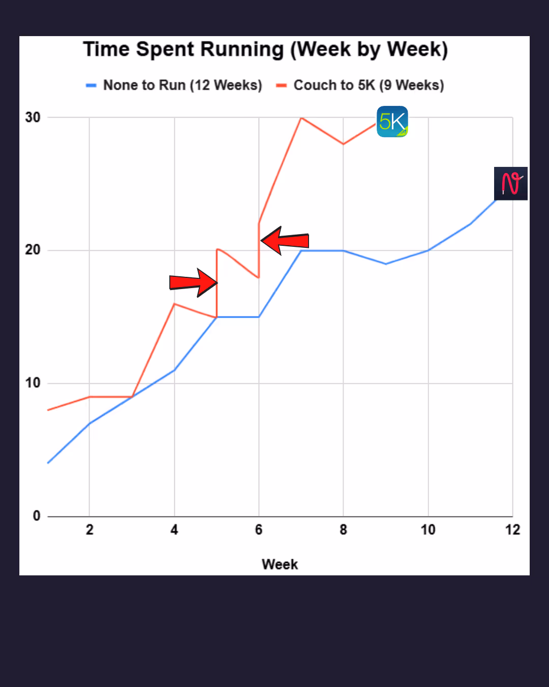 None to Run's progression chart compared to Couch to 5K shows this visually—C25K's line shoots up dramatically at Week 5, while N2R maintains a steady, sustainable climb.